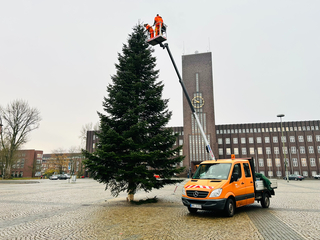 Für weihnachtlichen Lichterglanz sorgen die Weihnachtsbäume, die die Mitarbeitenden des städtischen Eigenbetriebes Technische Betriebe Wilhelmshaven (TBW) aufgestellt haben und derzeit fleißig schmücken. Die rund 14 Meter hohe Nordmanntanne auf dem Rathausplatz und die rund zwölf Meter hohe Nordmanntanne auf dem Berliner Platz sollen einen kleinen Farbakzent zur Weihnachtszeit setzen. Beide Tannen sind mit LED-Lampen geschmückt.
