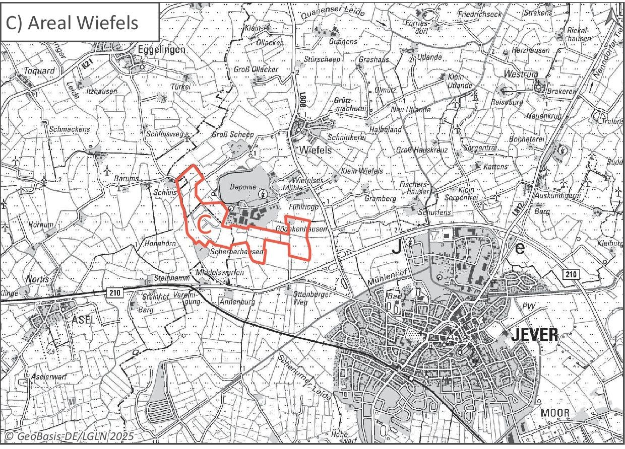 Die Flächenkulisse befindet sich nordwestlich der Stadt Jever in der Gemeinde Wangerland, im Bereich der Ortschaft Wiefels. Durch die vorgesehenen Flächen verläuft die Landkreisgrenze zwischen den Landkreisen Friesland und Wittmund. Die Flächen liegen zwischen dem Abfallwirtschaftszentrum Zweckverband Friesland/Wittmund und nördlich der B210.