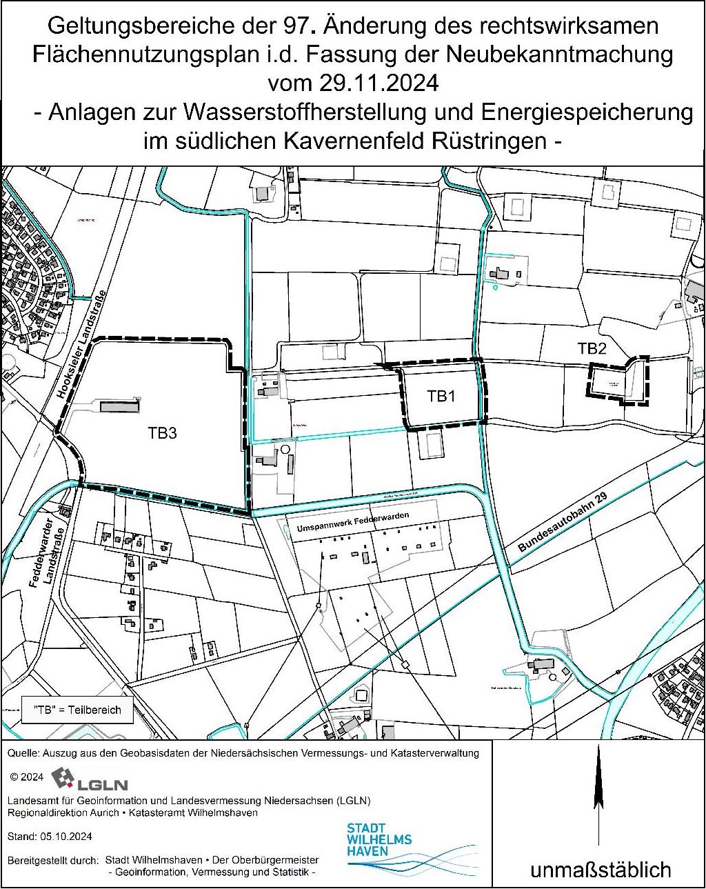 Der Rat der Stadt Wilhelmshaven hat in seiner Sitzung am 19.02.2025 aufgrund des § 2 (1) Baugesetzbuch (BauGB) in der Fassung der Bekanntmachung vom 03. November 2017 (BGBl. I S. 3634), zuletzt geändert durch Artikel 3 des Gesetzes vom 20. Dezember 2023 (BGBl. 2023 I Nr. 394), die Aufstellung der 97. Änderung des Flächennutzungsplans -Anlagen zur Wasserstoffherstellung und Energiespeicherung im südlichen Kavernenfeld Rüstringen- in der Fassung der Neubekanntmachung vom 29.11.2024 beschlossen.
