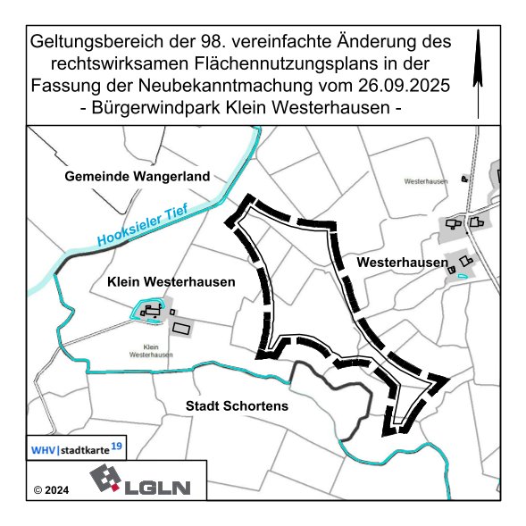 Der Rat der Stadt Wilhelmshaven hat in seiner Sitzung am 17.012.2025 aufgrund des § 2 (1) "des Baugesetzbuches in der Fassung der Bekanntmachung vom 3. November 2017 (BGBl. I S. 3634), das zuletzt durch Artikel 5 des Gesetzes vom 12. August 2025 (BGBl. 2025 I Nr. 189) geändert worden ist" die Aufstellung der 98. vereinfachten Änderung des Flächennutzungsplans in der Fassung der Neubekanntmachung vom 26.09.2025 -Bürgerwindpark Klein Westerhausen – und gleichzeitig den Entwurfs- und Veröffentlichungsbeschluss gefasst.